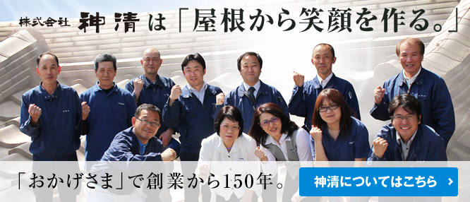 「神清」はおかげさまで創業から150年。 愛知一の「屋根屋に頼られる瓦屋」であると同時に「家の相談もできる屋根屋」として。 屋根のちょっとした疑問から、住宅診断士の知識を駆使した専門的なリフォームまで。 屋根・住宅のことなら神清になんでもご相談ください。