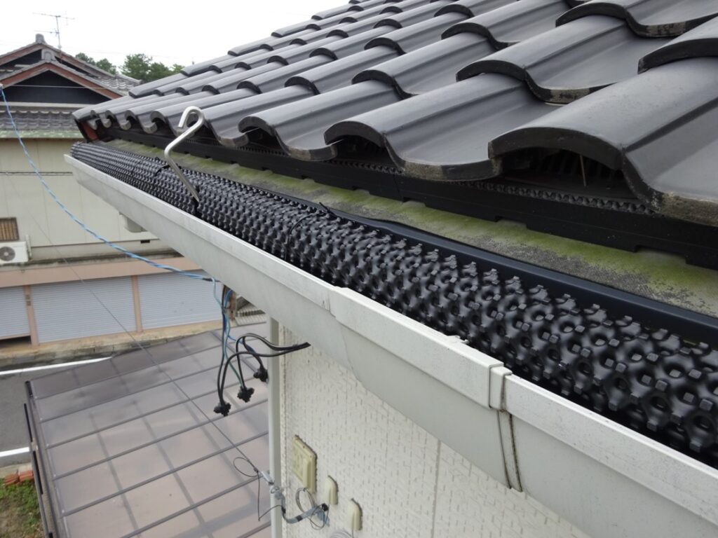 落ち葉よけシートでは、針葉樹の葉・細い枝・繊維状のゴミも侵入しにくくなり、雨樋の詰まり防止に有効です。