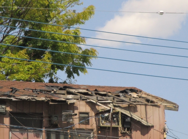 - 風災:ゲリラ豪雨時の強風・突風による飛来物で屋根が破損したことによる雨漏り