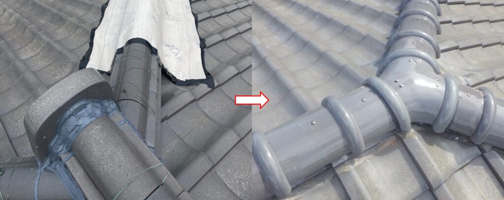 ・結果:瓦屋根の棟部は旧工法となっていたので、耐震・耐風仕様の冠瓦1本伏せで葺き直しして、雨漏り修理完了