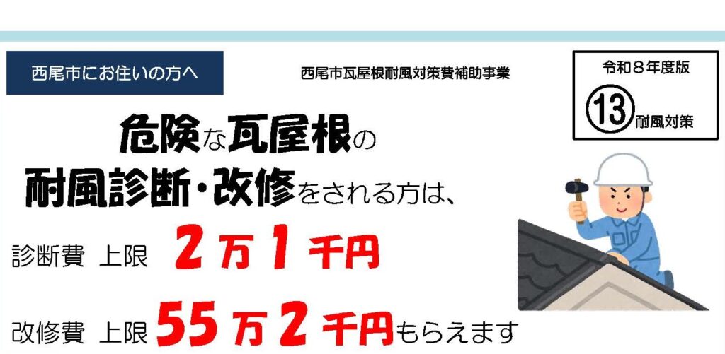 令和4年から瓦屋根の緊結方法が強化されましたが、それ以前の建物には危険な瓦屋根が多く残っています。市民の身体及び財産を保護するため、瓦の耐風対策を行う方に対して、補助を行っています。