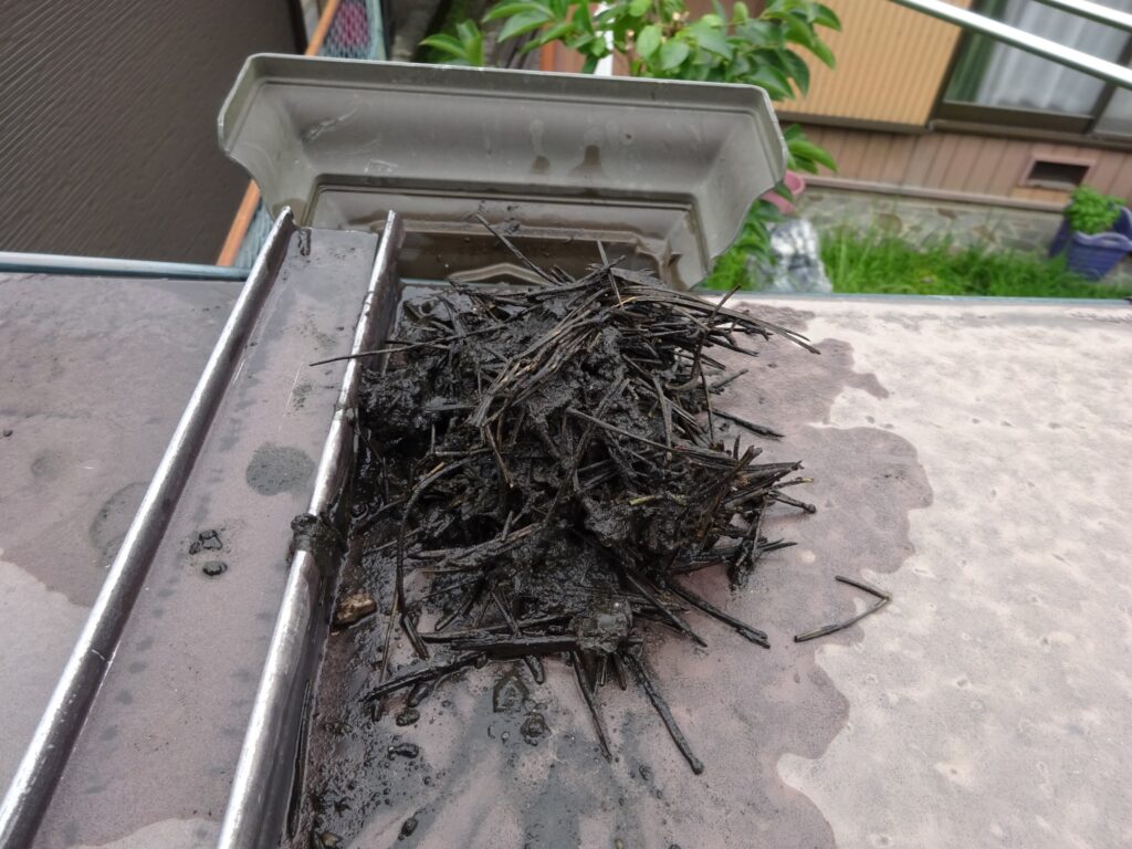 雨樋の中に、落ち葉、繊維状のもの、わら、枝、針葉樹などと土ぼこりが合わさって詰まることが多いです。