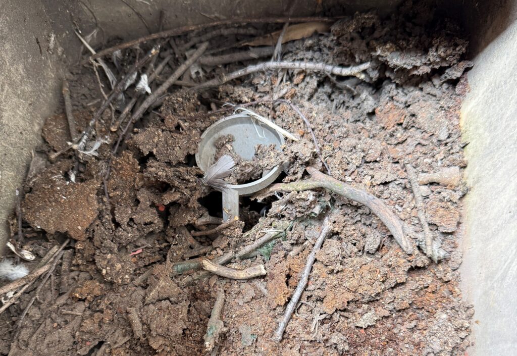 屋根に鳥がよく停まっている場合、鳥の巣に使用するわら、草、細い枝、紐などが屋根に落ちて、やがて、樋が詰まることがあります。