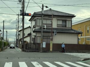 通学路の交差点では交通指導員さんが立哨して