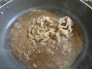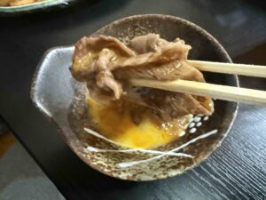 割りしたで少し煮込んだお肉を生卵に絡めて