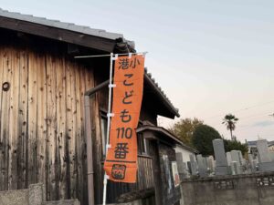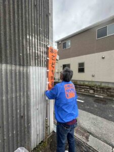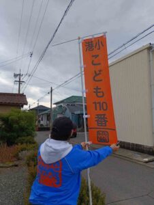 港小学区内のこども110番のぼり旗の交換をしています。