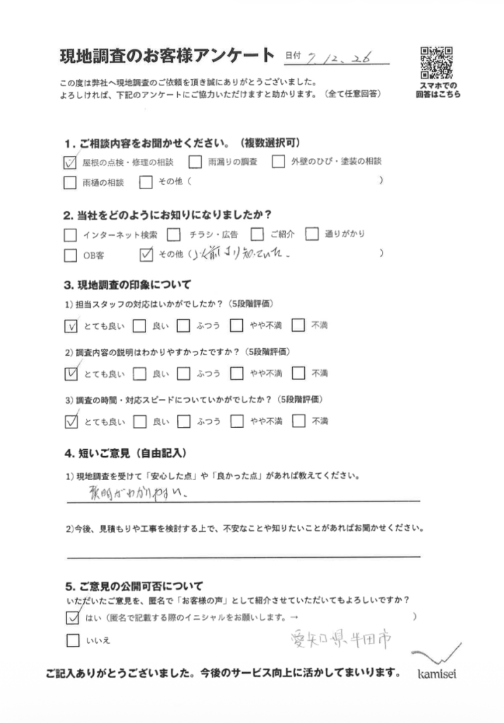現地調査アンケート掲載:【愛知県半田市】「説明がわかりやすい。」 公開: 2026年1月29日 更新:2026年1月29日 | お客様の声 現地調査この投稿は役に立ちましたか? 役に立った 役に立たなかった 0 人中 0 人がこの 投稿 は役に立ったと言っています。 神清からのお願い記事を最後まで読んでいただきありがとうございます。お客様の率直な感想をいただくため「役にたった」「役に立たなかった」ボタンを設置しました。私たちは、日々屋根にお困りのお客様にとって必要な情報をお伝えしたいと考えております。今後のご参考にさせて頂きますのでご協力よろしくお願いいたします。この記事に関連するサービスメニュー関連工事メニュー工事の現場をお見せします。関連する施工事例 現地調査アンケート掲載:【知多郡豊浜町】A.Y様... 現地調査アンケート掲載:【愛知県半田市】K .U... 事例一覧はこちら