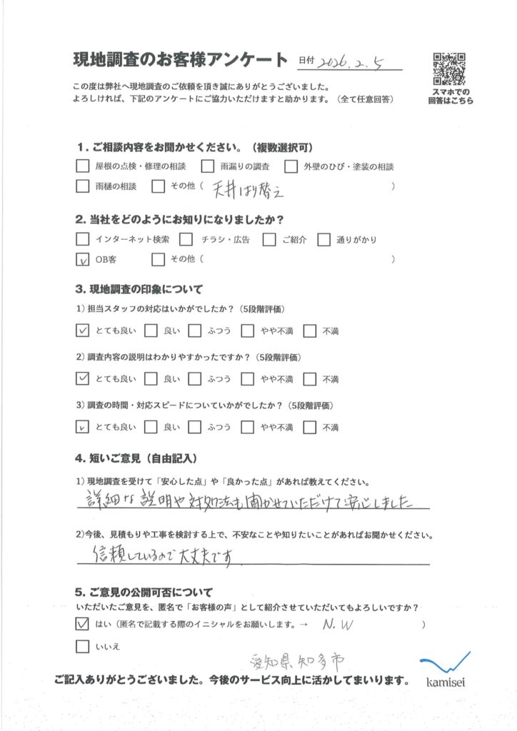 現地調査アンケート掲載:【愛知県知多市】天井張り替え工事 N .W様「詳細な説明や対処法も聞かせていただいた」 公開: 2026年2月27日 | お客様の声 現地調査この投稿は役に立ちましたか? 役に立った 役に立たなかった 0 人中 0 人がこの 投稿 は役に立ったと言っています。 神清からのお願い記事を最後まで読んでいただきありがとうございます。お客様の率直な感想をいただくため「役にたった」「役に立たなかった」ボタンを設置しました。私たちは、日々屋根にお困りのお客様にとって必要な情報をお伝えしたいと考えております。今後のご参考にさせて頂きますのでご協力よろしくお願いいたします。この記事に関連するサービスメニュー関連工事メニュー工事の現場をお見せします。関連する施工事例 現地調査アンケート掲載:【知多郡豊浜町】A.Y様... 現地調査アンケート掲載:【愛知県半田市】K .U... 現地調査アンケート掲載:【愛知県半田市】「説明が... 事例一覧はこちら