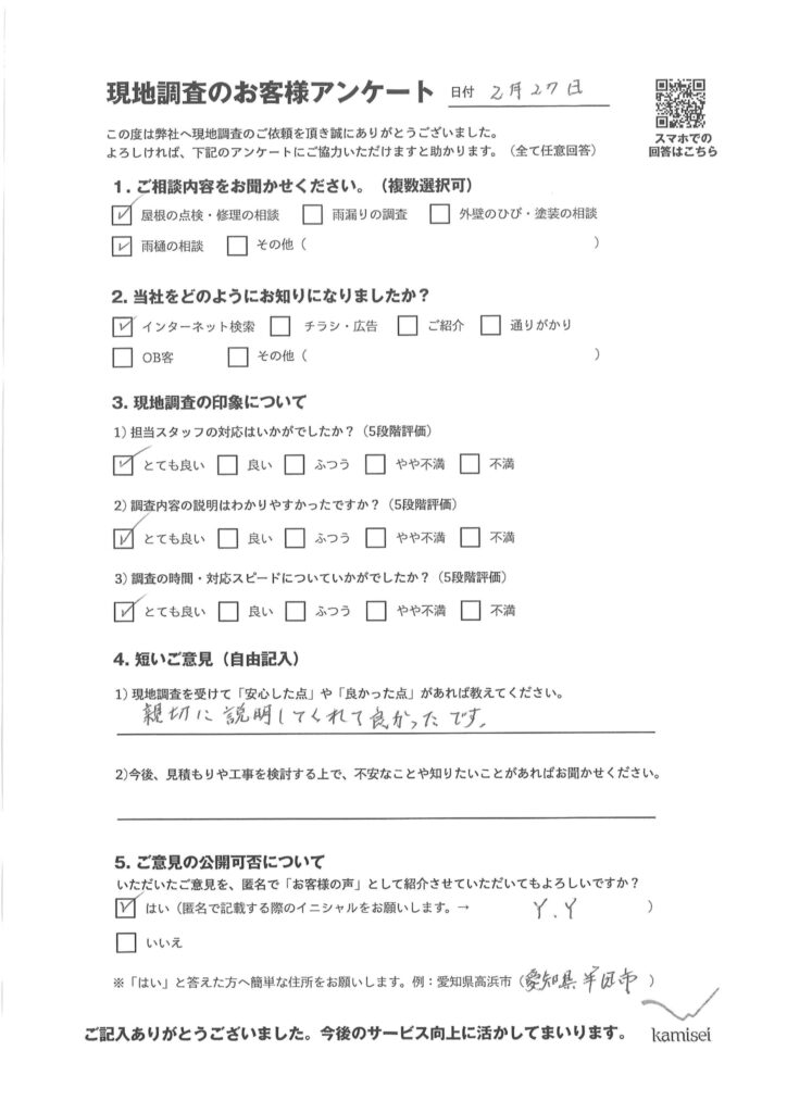 現地調査アンケート掲載:【愛知県半田市】Y.Y様「親切に説明してくれる。」 公開: 2026年4月3日 | お客様の声 現地調査この投稿は役に立ちましたか? 役に立った 役に立たなかった 0 人中 0 人がこの 投稿 は役に立ったと言っています。 神清からのお願い記事を最後まで読んでいただきありがとうございます。お客様の率直な感想をいただくため「役にたった」「役に立たなかった」ボタンを設置しました。私たちは、日々屋根にお困りのお客様にとって必要な情報をお伝えしたいと考えております。今後のご参考にさせて頂きますのでご協力よろしくお願いいたします。この記事に関連するサービスメニュー関連工事メニュー工事の現場をお見せします。関連する施工事例 現地調査アンケート掲載:【愛知県半田市】K.Y様... 現地調査アンケート掲載:【愛知県刈谷市】M様「わ... 現地調査アンケート掲載:【愛知県知多市】天井張り... 現地調査アンケート掲載:【知多郡豊浜町】A.Y様... 事例一覧はこちら