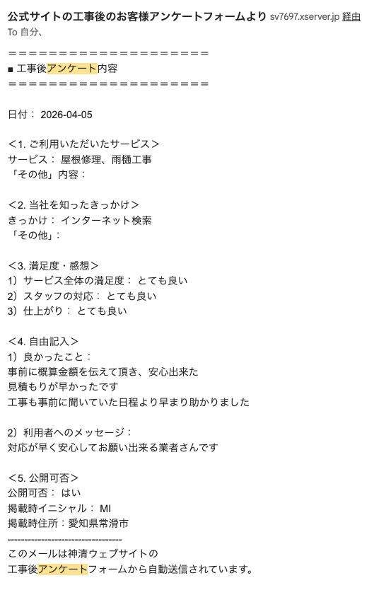 工事後アンケート掲載:【愛知県常滑市】M・I様 屋根修理「工事も事前に聞いていた日程より早まり助かりました」 公開: 2026年4月8日 | お客様の声 工事後の声この投稿は役に立ちましたか? 役に立った 役に立たなかった 0 人中 0 人がこの 投稿 は役に立ったと言っています。 神清からのお願い記事を最後まで読んでいただきありがとうございます。お客様の率直な感想をいただくため「役にたった」「役に立たなかった」ボタンを設置しました。私たちは、日々屋根にお困りのお客様にとって必要な情報をお伝えしたいと考えております。今後のご参考にさせて頂きますのでご協力よろしくお願いいたします。この記事に関連するサービスメニュー関連工事メニュー工事の現場をお見せします。関連する施工事例 工事後アンケート掲載:【愛知県刈谷市】M様 雨樋... 工事後アンケート掲載:【愛知県半田市】K.Y様 ... 工事後アンケート掲載:【愛知県常滑市】耐震工事「... 工事後アンケート掲載:【愛知県知多市】天井張り替... 事例一覧はこちら